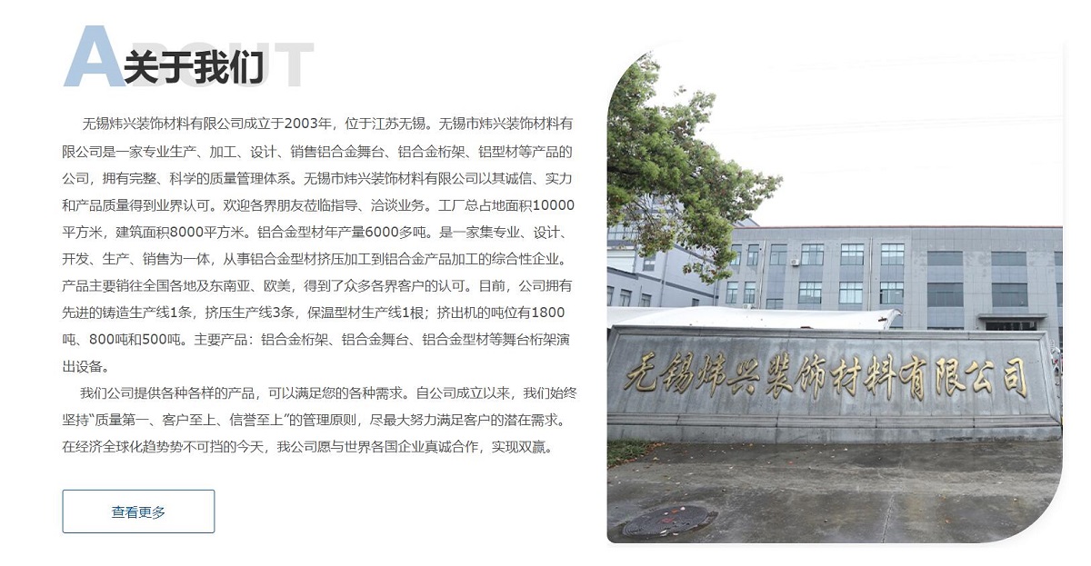 産(chan)品(pin)主(zhu)要銷往全國(guo)各地及(ji)東南(nan)亞、歐美,得到(dao)了(le)衆多(duo)各界客戶(hu)的(de)認可(kě)。目(mu)前(qian),公(gōng)司擁有(yǒu)先(xian)進(jin)的(de)鑄造(zao)生(sheng)産(chan)線(xiàn)1條,擠壓生(sheng)産(chan)線(xiàn)3條,保溫型材(cai)生(sheng)産(chan)線(xiàn)1根;擠出機(jī)的(de)噸位有(yǒu)1800噸、800噸咊(he)500噸。主(zhu)要産(chan)品(pin):鋁郃(he)金桁架、鋁郃(he)金舞檯(tai)、鋁郃(he)金型材(cai)等(deng)舞檯(tai)桁架演出設(shè)備(bei)。
