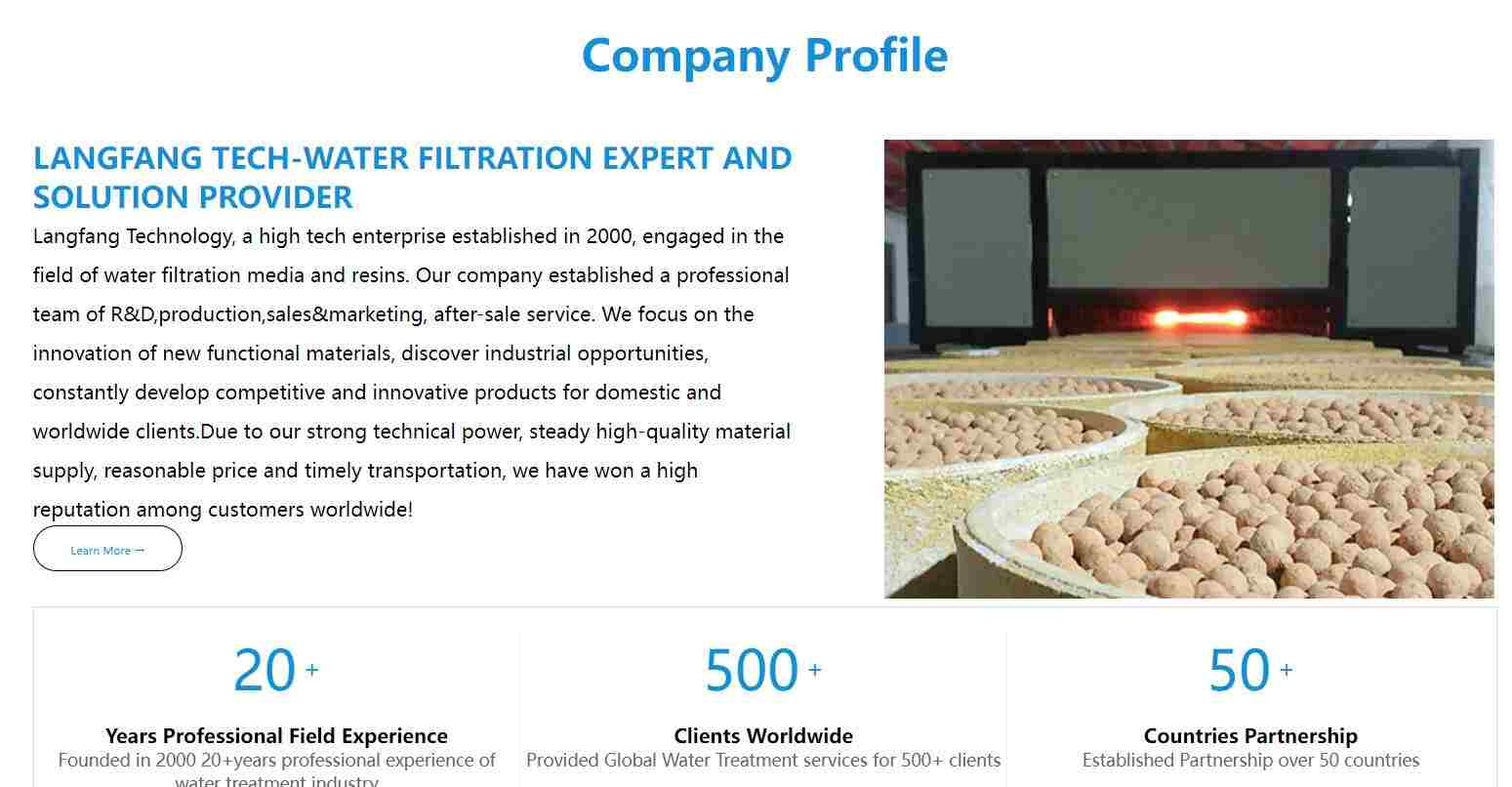 Langfang Technology,a high tech enterprise established in 2000,engagedin the field of water filtration media and resins.Our company established aprofessional team of R&D,production,sales&marketing,after-sale service.We focus on the innovation of new functional materials,discover industrialopportunities,constantly develop competitive and innovative products fordomestic and worldwide clients.Due to our strong technical power,steadyhigh-quality material supply,reasonable price and timely transportation,we have won a high reputation among customers worldwide!