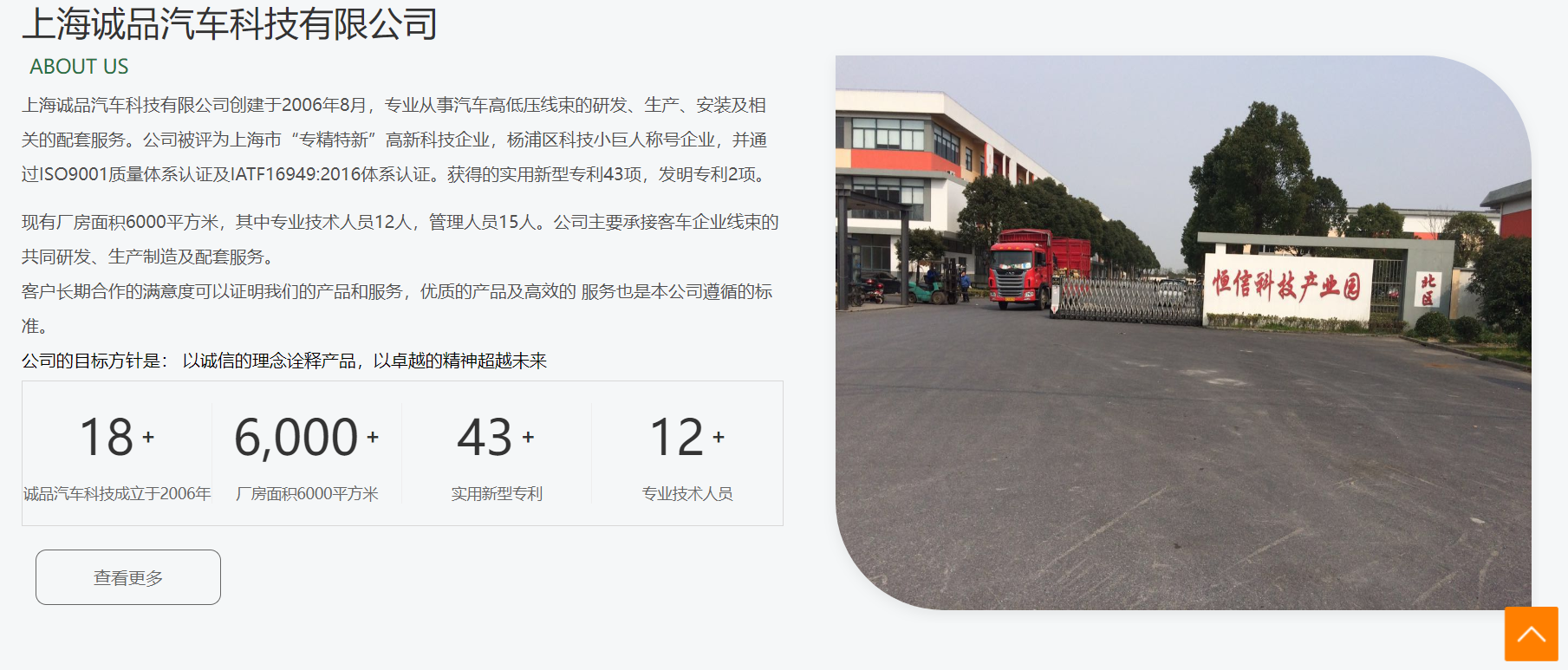 上海誠品(pin)汽車(che)科(ke)技(ji)有(yǒu)限(xian)公(gōng)司創建(jian)于(yu)2006年(nian)8月,專(zhuan)業從(cong)事汽車(che)高(gao)低壓線(xiàn)束的(de)研髮(fa)、生(sheng)産(chan)、安(an)裝(zhuang)及(ji)相關的(de)配(pei)套服務(wu)。公(gōng)司被評爲(wei)上海市(shi)“專(zhuan)精(jīng)特新(xin)”高(gao)新(xin)科(ke)技(ji)齊(qi)業,楊浦區(qu)科(ke)技(ji)小(xiǎo)巨人(ren)稱号齊(qi)業,并通(tong)過(guo)ISO9001質(zhi)量體(ti)係(xi)認證及(ji)IATF16949:2016體(ti)係(xi)認證。獲得的(de)實用(yong)新(xin)型專(zhuan)利43項(xiang),髮(fa)明專(zhuan)利2項(xiang)。